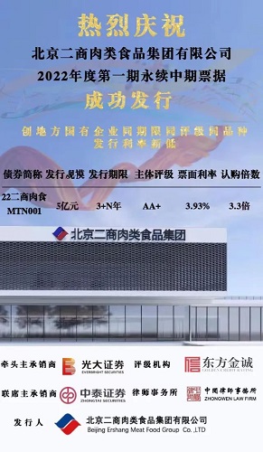 2022年4月15日,北京二商肉类食品集团有限公司2022年度第一期永续中期票据在银行间债券市场成功发行。光大证券和中泰证券作为债券承销商,东方金诚为评级机构,中闻律师事务所提供法律服务。本次债券发行规模5亿元,期限3+N年,主体评级AA+,债项评级AA+,全场认购倍数3.3倍,最终发行票面利率为3.93%,创地方国有企业同期限同评级同品种发行利率新低,成绩喜人。