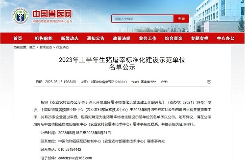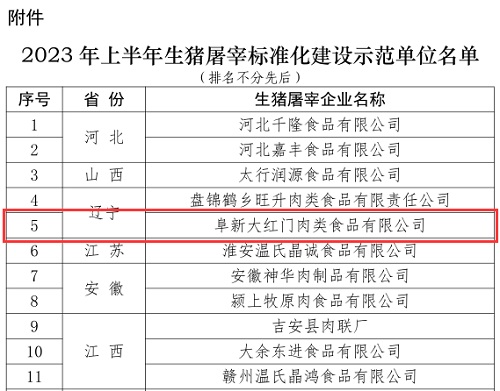 2023年8月15日,中国动物疫病预防控制中心(农业农村部屠宰技术中心)发布了2023年上半年生猪屠宰标准化建设示范单位名单公示,经专家评定,北京二商肉食集团所属阜新大红门肉类食品有限公司成功通过国家级生猪屠宰标准化建设示范单位认证。