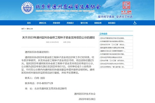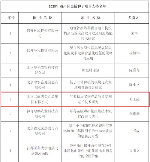 近日,北京市通州区科学技术协会发布《关于2023年通州区科协金桥工程种子资金支持项目公示的通知》,公布了通州区科学技术协会2023年金桥工程种子资金支持项目,北京二商肉类食品集团有限公司申报的《气调精加工猪产品的货架期延长技术研究》获得金桥工程种子资金项目支持。