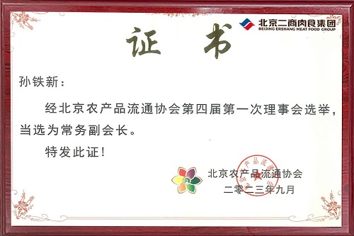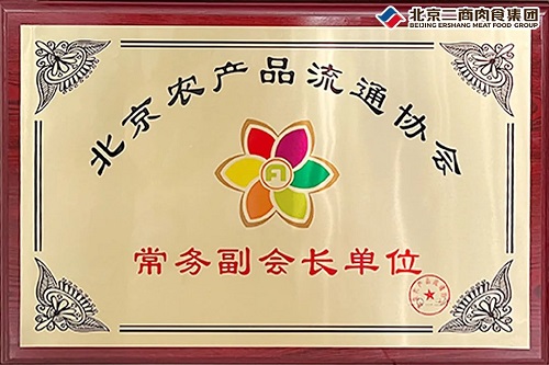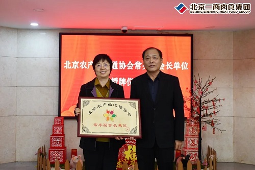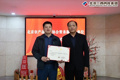 北京农产品流通协会第四届第一次理事会选举北京二商肉类食品集团有限公司为北京农产品流通协会常务副会长单位,公司总经理孙铁新为常务副会长。10月31日,协会领导一行莅临北京二商肉食集团集团参观座谈,并颁发常务副会长单位牌匾和常务副会长证书。