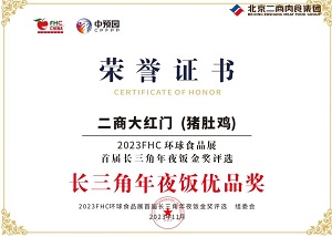 大会对“长三角年夜饭金奖”进行评选,通过现场品鉴及打分,北京二商肉食集团“大红门”预制菜系列产品凭借精美的包装设计和独特的产品口味,得到专家评审与同行食客的一致认可,“大红门”预制菜“猪肚鸡”广受评委欢迎,荣获“长三角年夜饭优品奖”。