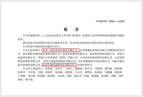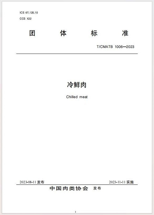 2023年11月11日,由北京二商肉类食品集团有限公司牵头起草编制的《冷鲜肉》团体标准(T/CMATB 1006-2023)完成立项、编制起草、征求意见、评审、修改、审查、批准及备案等标准制定流程,经中国肉类协会审批通过,正式发布实施。