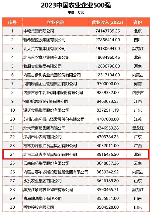 近日,农民日报社发布了“2023中国农业企业500强”榜单(公示版),经信息汇集、严格审核、专家评议等程序,北京二商肉类食品集团有限公司在首农食品集团的带领下,凭借创新经营、务实发展的良好态势,以2022年度391.6亿元的营业收入再次入选该榜单,位居第24位,较上一年提升7个位次。