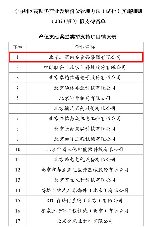近日,通州区经济信息化局发布了《关于公示通州区2023年度高精尖产业发展资金及“专精特新”企业高质量发展的若干措施拟支持企业名单的通知》,北京二商肉食集团凭借产业规模和产值贡献优势,入选产值贡献奖励类支持项目,荣获通州区高精尖产业发展资金支持。