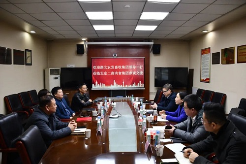 2024年1月11日,湖北农发畜牧集团党委书记、董事长、总经理石萍一行莅临北京二商肉食集团参观交流,双方就如何围绕各自业务领域开展紧密合作进行高效沟通。北京二商肉食集团党委书记、董事长王宗秀,总经理孙铁新,副总经理郭克谦、徐德江及相关领导接待。