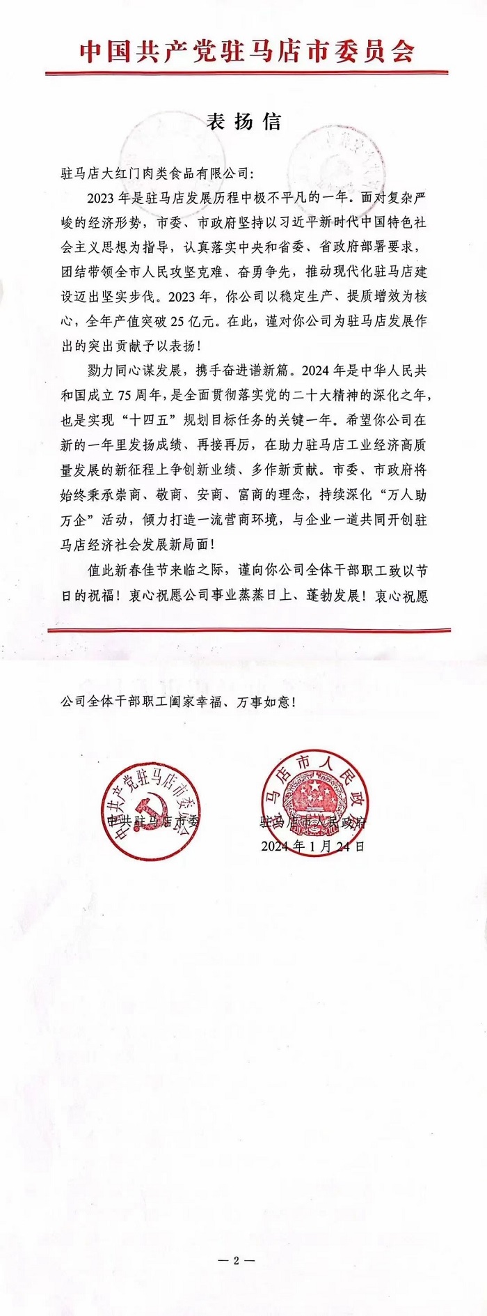 这封表扬信承载着驻马店市委、市政府对北京二商肉食集团及驻马店大红门公司服务地方经济社会发展最好的肯定,不仅是荣誉,更是责任与动力。北京二商肉食集团将更好履行国有企业的责任担当,充分发挥企业自身优势与驻马店市土地和农业资源优势,围绕肉食产业发展,延伸产业链条,丰富产品结构,强化竞争力提升,在企业高质量发展的新征程上开创新业绩,持续助力驻马店市经济发展。