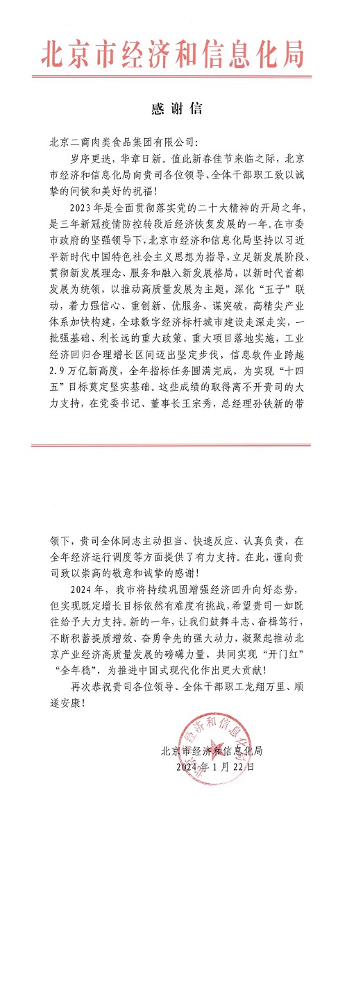 近日,北京二商肉食集团收到北京市经济和信息化局发来的感谢信,向北京二商肉食集团全体干部职工致以诚挚的问候和美好的祝福,同时对北京二商肉食集团全体员工的主动担当、快速反应,在全年经济运行调度等方面的支持致以崇高的敬意。