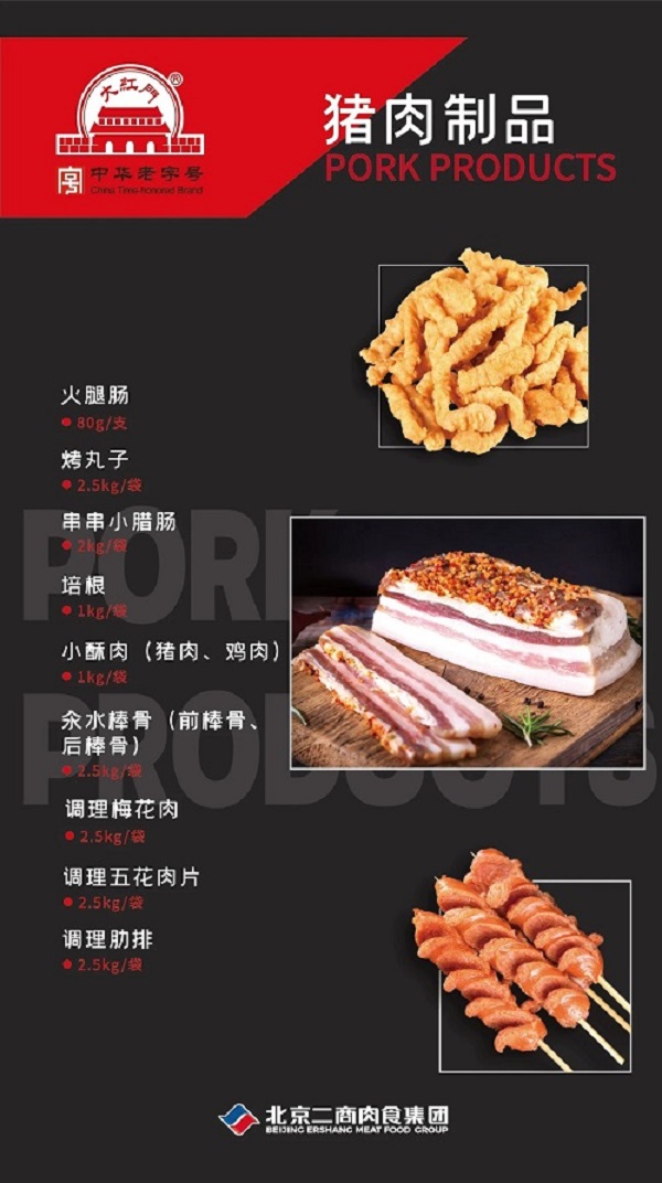 生鲜板块、肉制品板块、清真板块分别围绕“大红门”“月盛斋”“穆香源”等品牌,全面推出“红门小厨”生鲜烧烤食材系列、“大红门”肉制品烧烤食材系列、“月盛斋”和“穆香源”清真烧烤食材系列近50款产品。其中,月盛斋澳洲香草T骨羊排、大红门迷迭香烤鸡凭借高端大气的产品包装和独特的产品口味获得大家的一致认可。