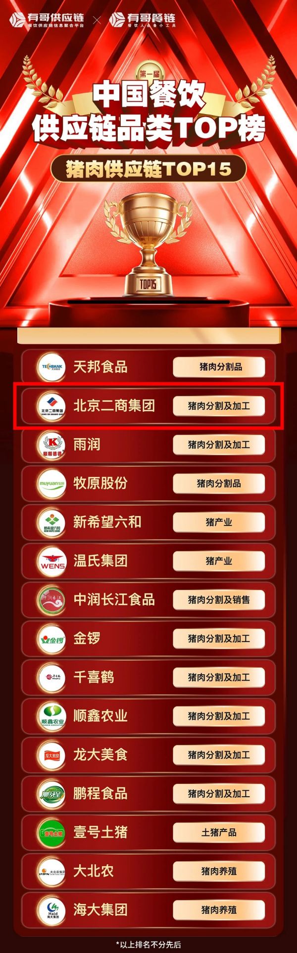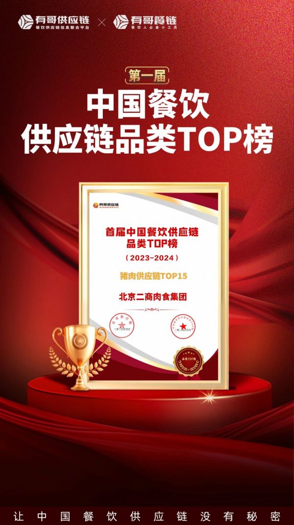 4月12日,有哥供应链发布首届《中国餐饮供应链品类TOP榜》单,经专业评委会评定和消费者人气投票,北京二商肉类食品集团有限公司凭借强大的综合实力、卓越的供应链管理能力、优质的产品质量以及高效的物流配送服务,成功跻身《中国餐饮供应链品类TOP榜》猪肉供应链TOP15榜单。