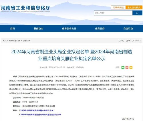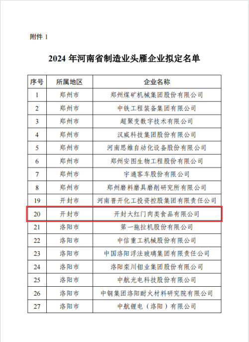 7月4日,河南省工业和信息化厅发布了《2024年河南省制造业头雁企业拟定名单暨2024年河南省制造业重点培育头雁企业拟定名单》,经企业自主申报、主管部门推荐、专家评审,北京二商肉食集团所属开封大红门肉类食品有限公司再次荣获“河南省制造业头雁企业”荣誉称号。