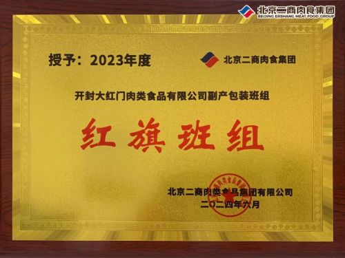 开封大红门公司副产品包装班组执着专注、精益求精,以实干践行初心使命,以业绩彰显责任担当。2023年产出产品近3万吨,产品合格率稳定保持100%,凭借高效的团队协作能力和过硬的产品质量,被评为“北京二商肉食集团2023年度红旗班组”荣誉称号。