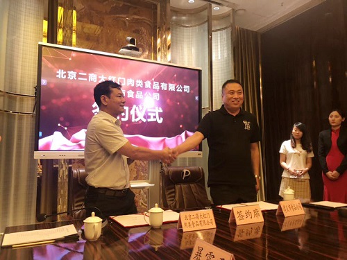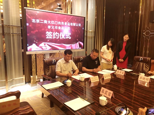 2019年7月17日,北京二商大红门肉类食品有限公司所属陕西蒲城大红门肉类食品有限公司与孝义市食品公司在鹏飞国宾酒店隆重举行了合作签约仪式。二商大红门公司总经理吴启成、经理孙铁新、蒲城大红门公司经理杨辉、孝义市食品公司董事长霍彦富及有关部门领导出席签约仪式;吕梁市副市长尉文龙、吕梁市农业农村局局长孙尚平、孝义市市长王廷洪、副市长王勇亲临现场,共同见证签约仪式。