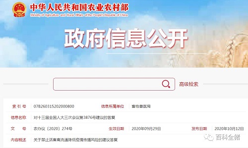 10月12日,农业农村部发布《对十三届全国人大三次会议第3876号建议的答复》,文件提到李小红等4名全国人大代表提出,全面禁止活畜禽调运,推广肉类冷鲜上市,降低疫情传播风险。