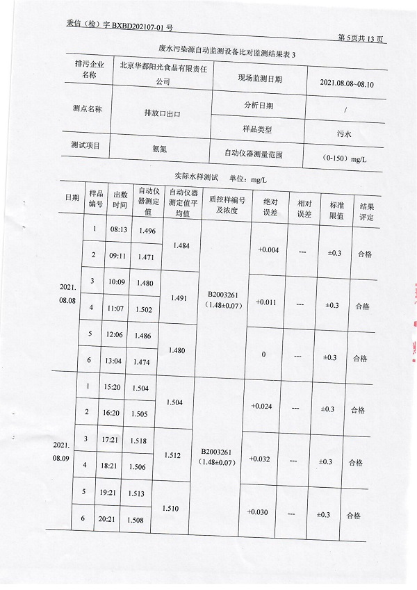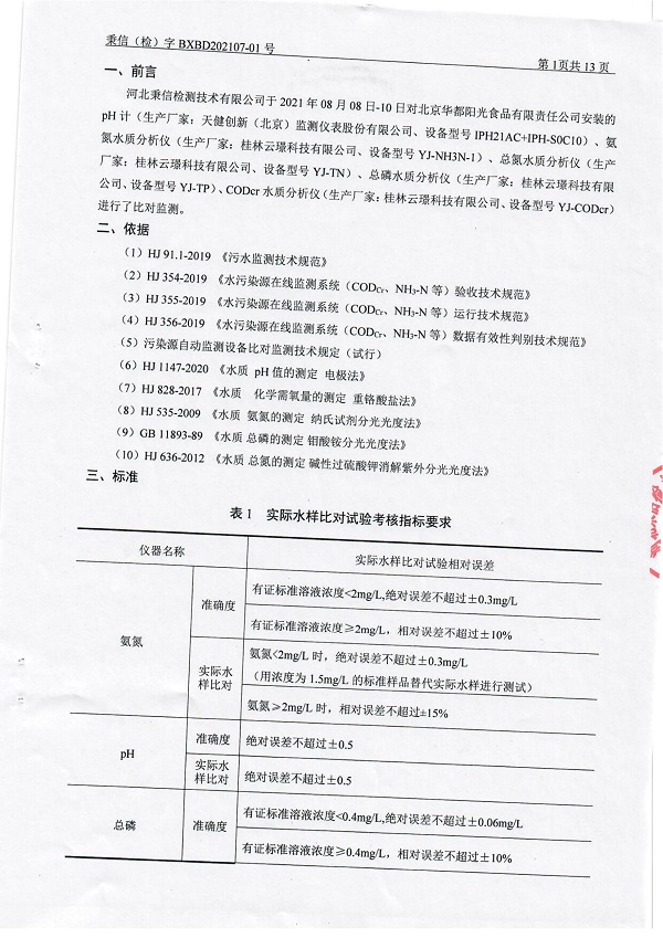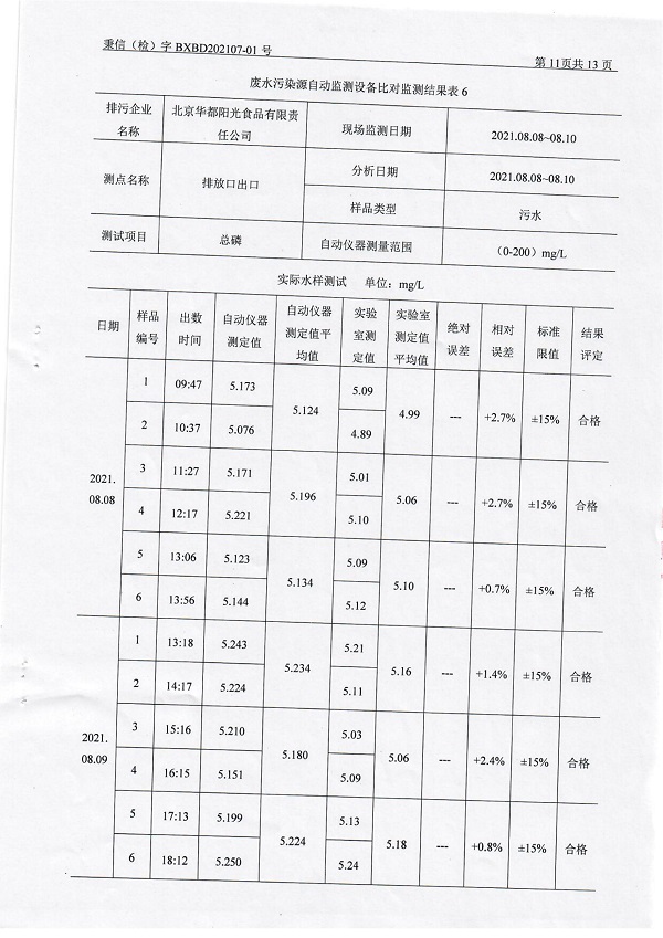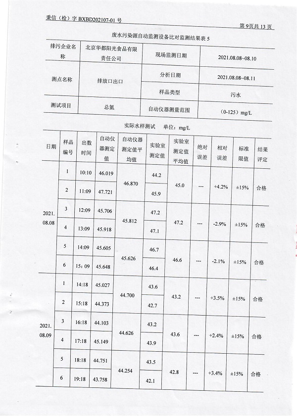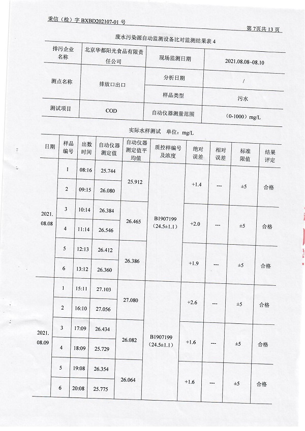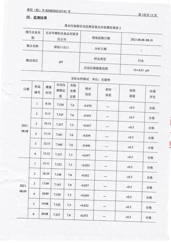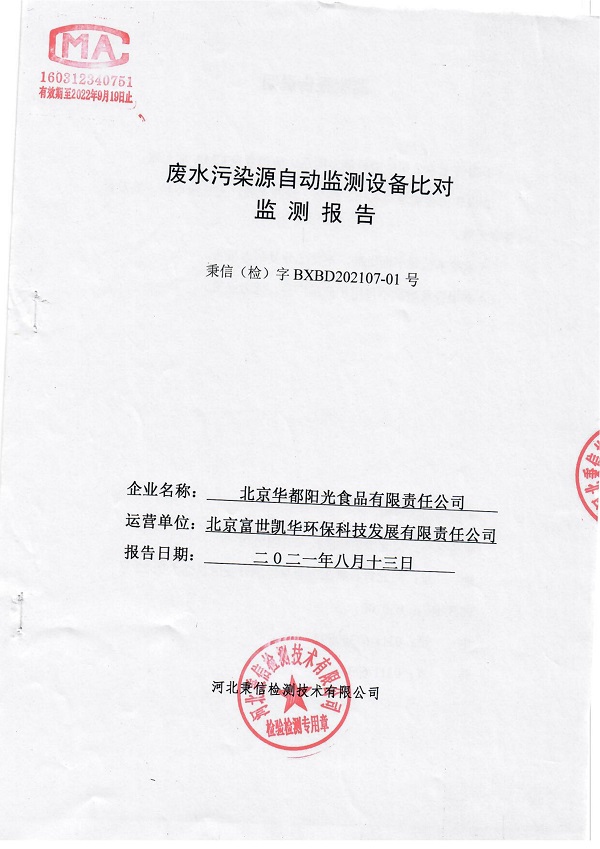 北京华都阳光食品有限责任公司废水污染源自动监测设备对比检测报告