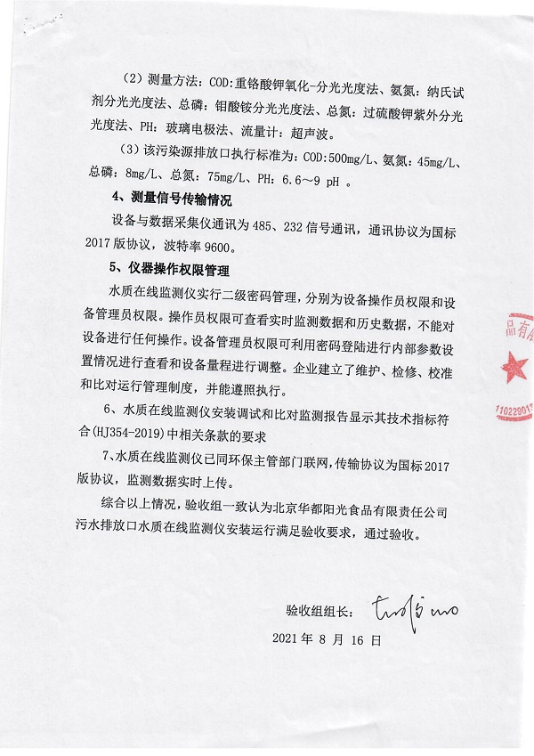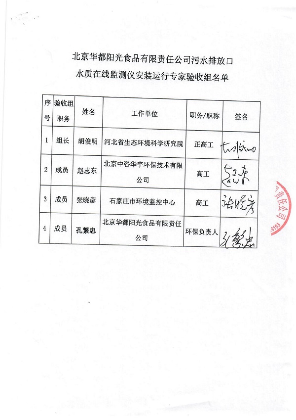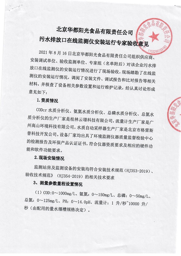北京华都阳光食品有限责任公司污水在线检测仪安装专家验收意见