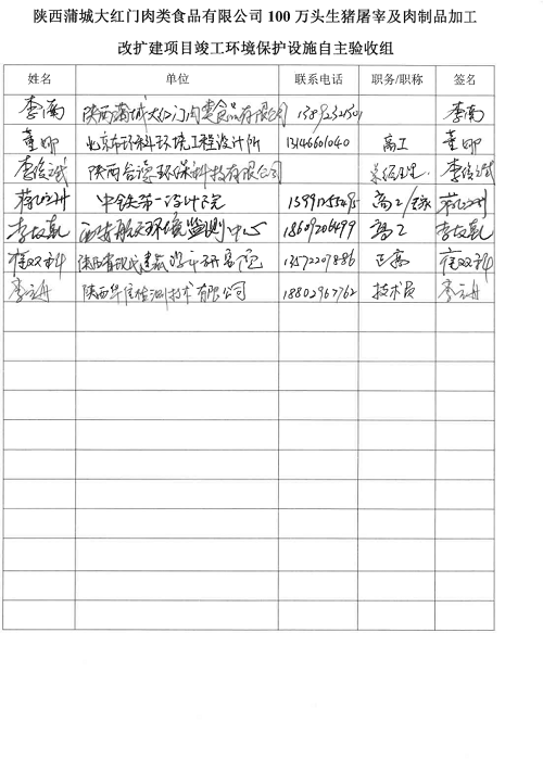 2019年1月19日,陕西蒲城大红门肉类食品有限公司根据《建设项目竣工环境保护验收暂行办法》的规定,组织召开了“100万头生猪屠宰及肉制品加工改扩建项目”( 水、大气、噪声环保设施)竣工环境保护验收会,参加验收会议的有:竣工环境保护验收监测报告编制单位(陕西华信检测技术有限公司)等单位的代表以及有关专家共5人,会议成立了验收组(名单附后)。与会代表对该工程配套建设的水、大气环保设施落实情况进行了现场检查,听取了建设单位对工程环境保护执行情况的介绍和陕西华信检测技术有限公司对工程竣工环境保护验收监测报告的汇报,核实了有关资料,经认真讨论,形成验收组意见如下: